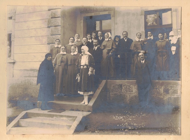 Diakonissen des Mutterhauses "Gottessegen" mit Ida Tänzer (Mitte der Dreiergrupp), Katharina Baldinger (vierte von rechts in der oberen Reihe) und Königin Maria