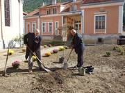 Bischof Reinhart Guib (rechts) und Landeskirchenkurator Friedrich Philippi pflanzten ein Apfelbäumchen am Kirchhof der Obervorstädter Kirche in Kronstadt während des Kirchentages an. Foto: der Verfasser