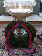 Das rotblaue Band am Kranz erinnert in erster Linie an die Opfer aus den Reihen der Siebenbürger Sachsen, aber ausdrücklich auch an unzählige Opfer in allen anderen Volksgemeinschaften: Juden, Roma, Ungarn. Die kleinen Kerzen sind Zeichen des lebendigen Gedenkens an jede einzelne Seele, die im Weltkrieg und unter seinen Folgen gelitten hat. Die große Kerze breitet ihr Licht aber über alle kleinen Lichter aus. Foto: privat