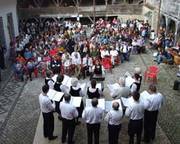Der die sächsische Tracht tragende vereinte Kirchenchor aus Petersberg und Honigberg bei seinem Auftritt vor einem zahlreichen Publikum im Innenhof der Weberbastei. Weitere Fotos vom „Bunten Abend“ auf Seite 4.